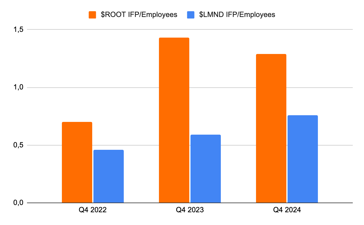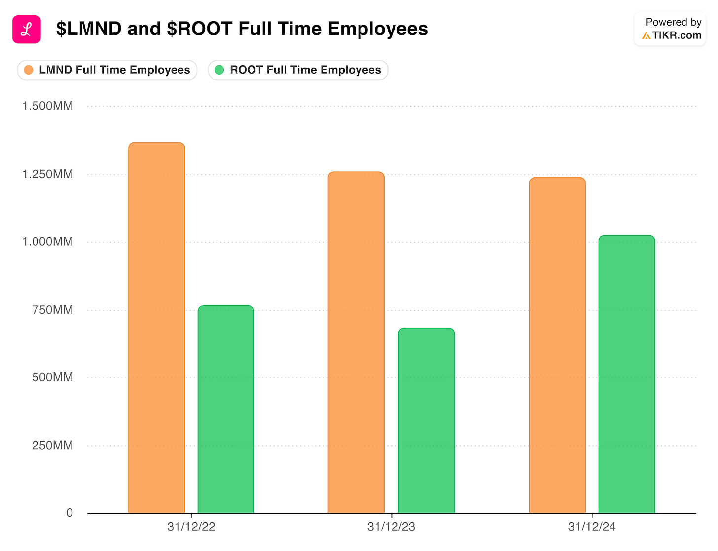 Their revenue keeps climbing even as employee numbers hold steady or dip slightly, whereas Root’s headcount feels lumpier, prone to occasional spikes despite no major overall growth.