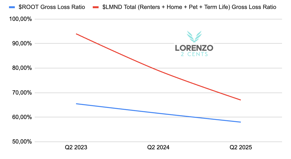 This advantage shows clearly in recent gross loss ratios: in Q2 2025, Root hit 61%, improved from 67.1% in Q1. Lemonade was at 82% and 88%. That’s a big gap.
