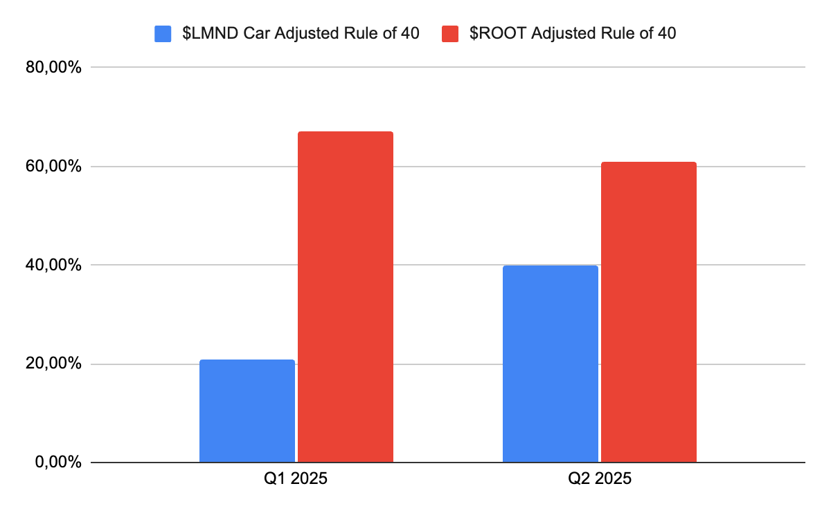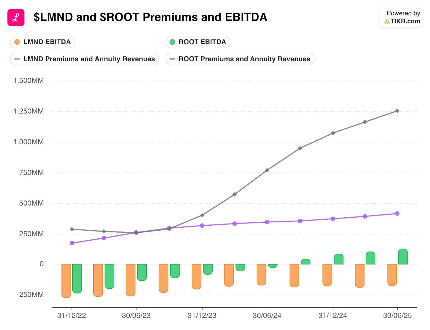 Root still leads on the absolute figures, riding high on their scale and the inherent efficiencies of car insurance. But the trends paint a different picture—one that tilts toward Lemonade.