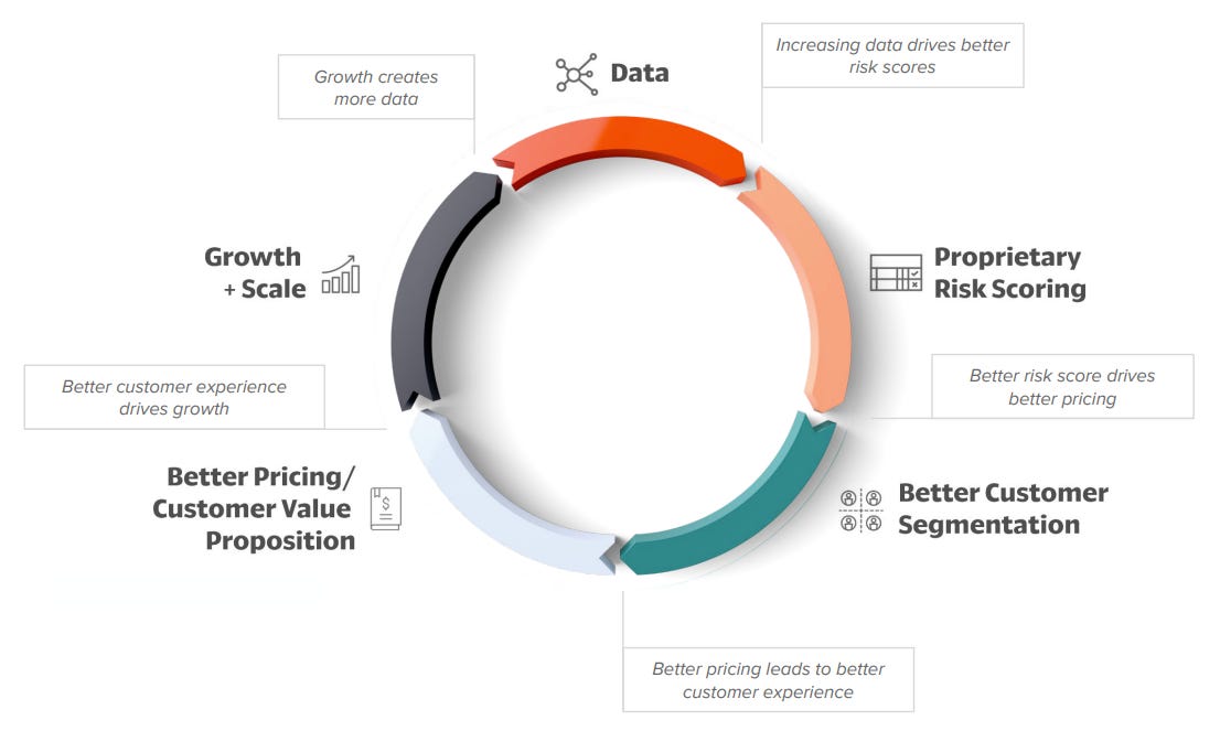 Root shows this in their shareholder letters with a simple infographic: a flywheel with “Data” at the center.