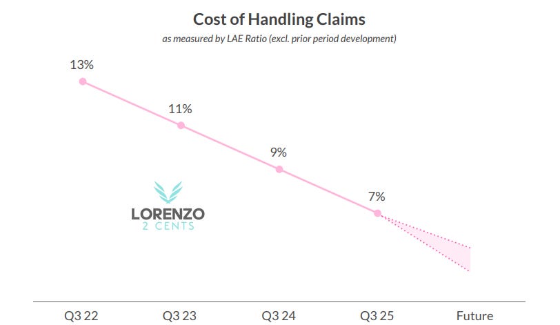 For context, large carriers typically report around 9% LAE. In other words, they spend about 9% of their premium dollars to handle claims on top of the claim payment itself. Root, which is focused on car, is a bit less directly comparable to Lemonade, which has a broader mix; but for the record, in Q3, it reported 7.5%, still a good number.
