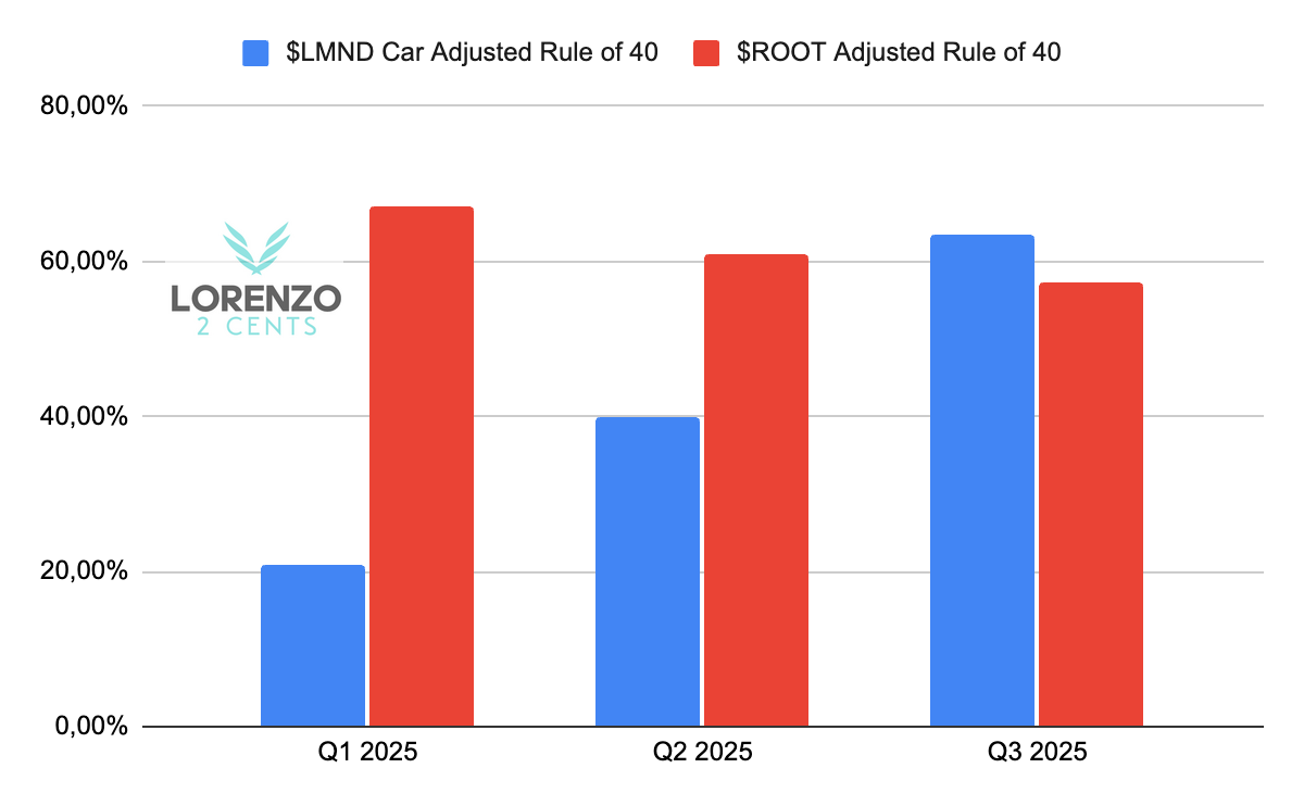 What we are seeing with Car is exactly what the management said would happen: it becoming the engine of growth for the entire Lemonade business while the loss ratio slowly comes down to a level that allows it to maximise the gross profit, as with the rest of the products. Unexpectedly, this quarter, Car’s gross loss ratio printed at 76%, down from 82% in the previous quarter—a big improvement that allows Lemonade to take the lead on the adjusted Rule of 40 metric I use to compare it to Root, which I consider the benchmark for Lemonade Car.