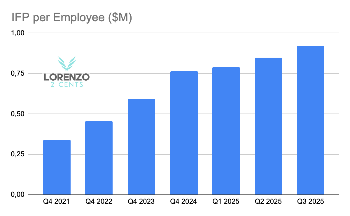 At this point, nobody should have any doubt that Lemonade is successfully leveraging AI to disrupt the insurance industry. This quarter, headcount decreased sequentially from 1,274 in Q2 to 1,259 in Q3, and it was up about 3.5% versus the prior year and essentially flat versus 24 months ago. As a consequence, IFP per employee does not stop growing.