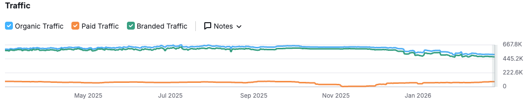 Looking at the web traffic of IlMakiage.com—the website of the brand that accounts for 70% of revenue—we can see a sharp decline starting in December, approximately when the issue became serious. The drop is about 30% from the high in September.